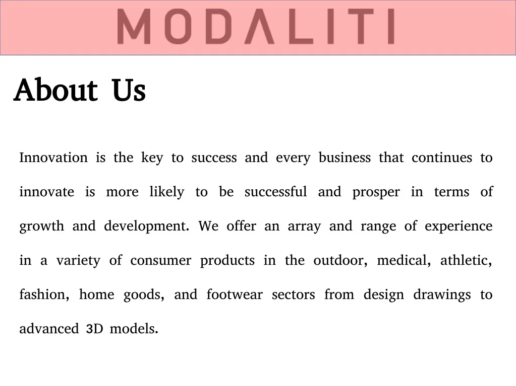 About Us Innovation is the key to success and every business that continues to innovate is more likely to be successful and prosper in terms of growth and development. We offer an array and range of experience in a variety of consumer products in the outdoor, medical, athletic, fashion, home goods, and footwear sectors from design drawings to advanced 3D models.