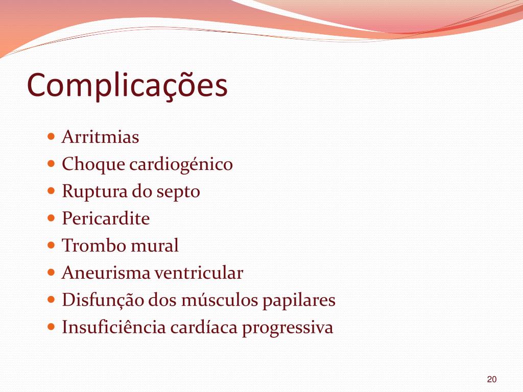 Complicações • Arritmias • Choque cardiogénico • Ruptura do septo • Pericardite • Trombo mural • Aneurisma ventricular • Disfunção dos músculos papilares • Insuficiência cardíaca progressiva