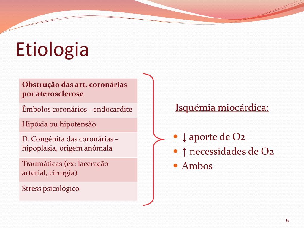 Etiologia Isquémia miocárdica: • ↓ aporte de O2 • ↑ necessidades de O2 • Ambos