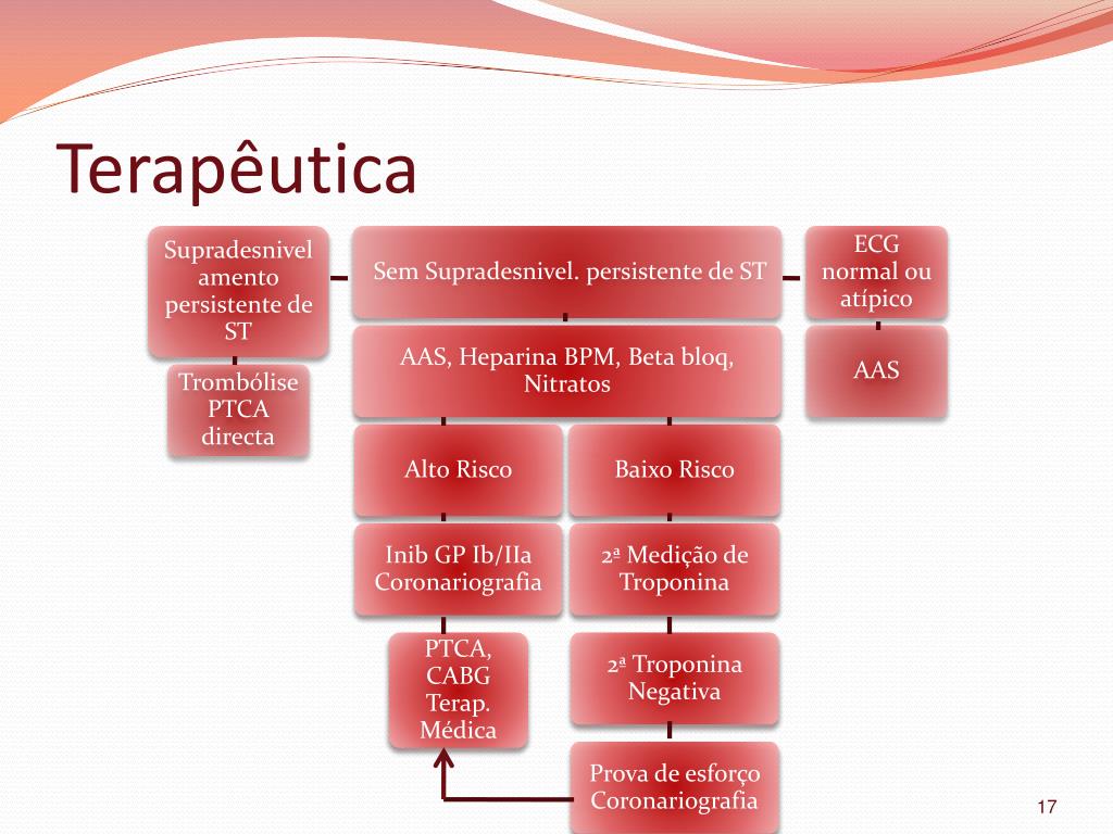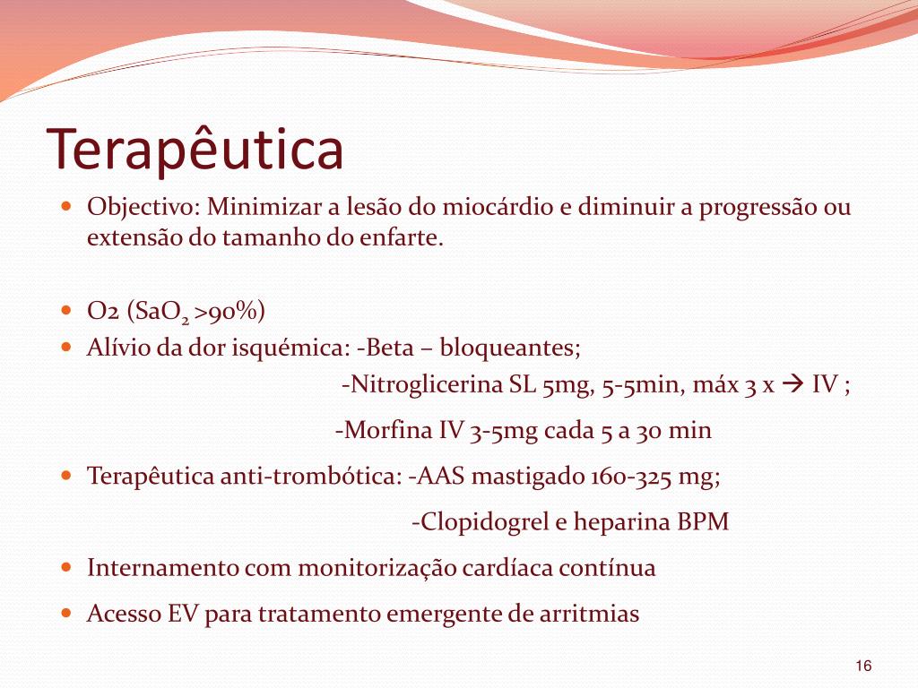 Terapêutica • Objectivo: Minimizar a lesão do miocárdio e diminuir a progressão ou extensão do tamanho do enfarte. • O2 (SaO2 >90%) • Alívio da dor isquémica: -Beta – bloqueantes; -Nitroglicerina SL 5mg, 5-5min, máx 3 x IV ; -Morfina IV 3-5mg cada 5 a 30 min • Terapêutica anti-trombótica: -AAS mastigado 160-325 mg; -Clopidogrel e heparina BPM • Internamento com monitorização cardíaca contínua • Acesso EV para tratamento emergente de arritmias