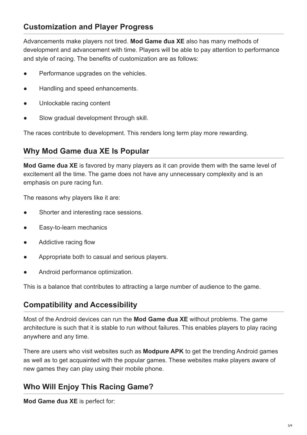 Customization and Player Progress Advancements make players not tired. Mod Game đua XE also has many methods of development and advancement with time. Players will be able to pay attention to performance and style of racing. The benefits of customization are as follows: ● Performance upgrades on the vehicles. ● Handling and speed enhancements. ● Unlockable racing content ● Slow gradual development through skill. The races contribute to development. This renders long term play more rewarding. Why Mod Game đua XE Is Popular Mod Game đua XE is favored by many players as it can provide them with the same level of excitement all the time. The game does not have any unnecessary complexity and is an emphasis on pure racing fun. The reasons why players like it are: ● Shorter and interesting race sessions. ● Easy-to-learn mechanics ● Addictive racing flow ● Appropriate both to casual and serious players. ● Android performance optimization. This is a balance that contributes to attracting a large number of audience to the game. Compatibility and Accessibility Most of the Android devices can run the Mod Game đua XE without problems. The game architecture is such that it is stable to run without failures. This enables players to play racing anywhere and any time. There are users who visit websites such as Modpure APK to get the trending Android games as well as to get acquainted with the popular games. These websites make players aware of new games they can play using their mobile phone. Who Will Enjoy This Racing Game? Mod Game đua XE is perfect for: 3/4