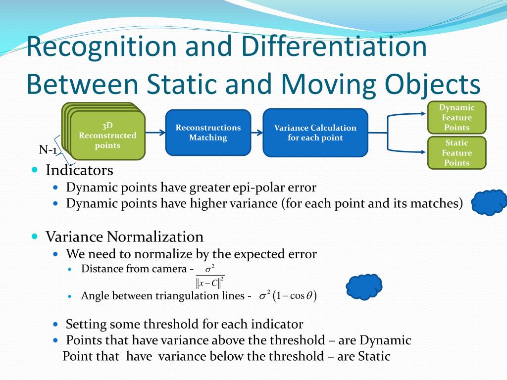 Recognition and DifferentiationBetween Static and Moving Objects • Indicators • Dynamic points have greater epi-polar error • Dynamic points have higher variance (for each point and its matches) • Variance Normalization • We need to normalize by the expected error • Distance from camera - • Angle between triangulation lines - • Setting some threshold for each indicator • Points that have variance above the threshold – are Dynamic Point that have variance below the threshold – are Static Dynamic Feature Points Variance Calculation for each point Reconstructions Matching Static Feature Points 3D Reconstructed points 3D Reconstructed points 3D Reconstructed points 3D Reconstructed points N-1