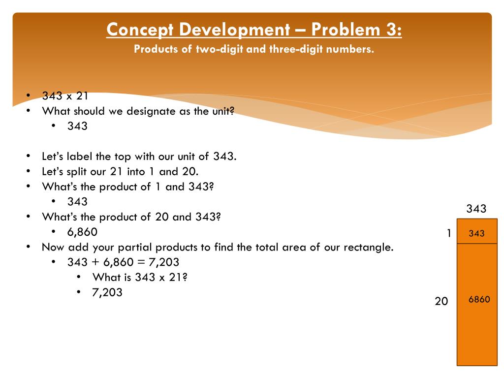 Concept Development – Problem 3:Products of two-digit and three-digit numbers. • 343 x 21 • What should we designate as the unit? • 343 • Let’s label the top with our unit of 343. • Let’s split our 21 into 1 and 20. • What’s the product of 1 and 343? • 343 • What’s the product of 20 and 343? • 6,860 • Now add your partial products to find the total area of our rectangle. • 343 + 6,860 = 7,203 • What is 343 x 21? • 7,203 343 1 343 20 6860
