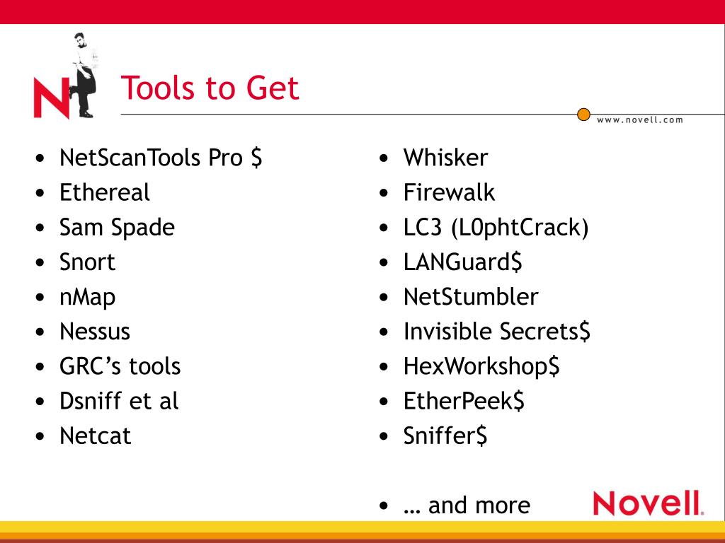 NetScanTools Pro $ Ethereal Sam Spade Snort nMap Nessus GRC’s tools Dsniff et al Netcat Whisker Firewalk LC3 (L0phtCrack) LANGuard$ NetStumbler Invisible Secrets$ HexWorkshop$ EtherPeek$ Sniffer$ … and more Tools to Get