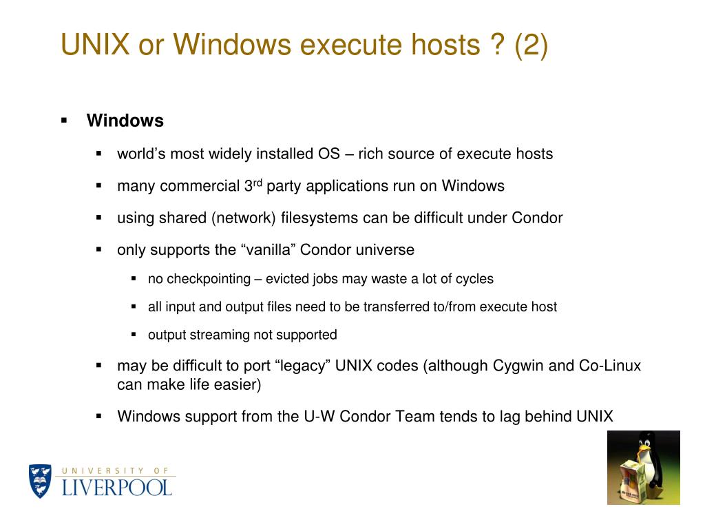 UNIX or Windows execute hosts ? (1) • UNIX • Condor’s natural environment • not widely installed on desktop machines (but depends on institution...) • supports the Condor “standard universe” containing many useful features • checkpointing allows jobs to be migrated from one machine to another without loss of useful work • Remote Procedure Calls give transparent access to files on submit host • streaming of standard output (stdout) from jobs to submit host • Network filesystems work well making installation and configrationmuch easier • leverages large amount of scientific and engineering codes which have been developed under UNIX