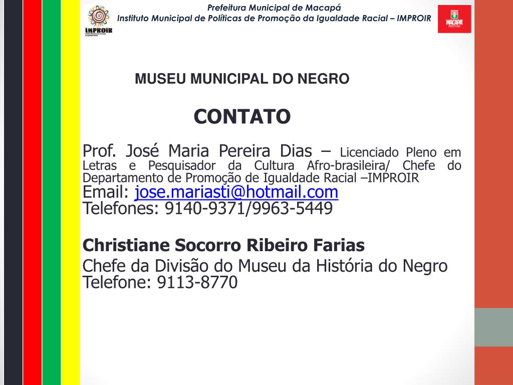 Prefeitura Municipal de Macapá Instituto Municipal de Políticas de Promoção da Igualdade Racial – IMPROIR MUSEU MUNICIPAL DO NEGRO CONTATO Prof. José Maria Pereira Dias – Licenciado Pleno em Letras e Pesquisador da Cultura Afro-brasileira/ Chefe do Departamento de Promoção de Igualdade Racial –IMPROIR Email: jose.mariasti@hotmail.com Telefones: 9140-9371/9963-5449 Christiane Socorro Ribeiro Farias Chefe da Divisão do Museu da História do Negro Telefone: 9113-8770