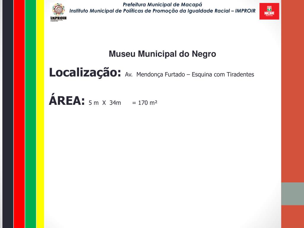 Prefeitura Municipal de Macapá Instituto Municipal de Políticas de Promoção da Igualdade Racial – IMPROIR Museu Municipal do Negro Localização: Av. Mendonça Furtado – Esquina com Tiradentes ÁREA: 5 m X 34m = 170 m²