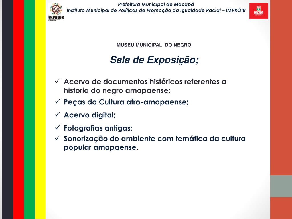 Prefeitura Municipal de Macapá Instituto Municipal de Políticas de Promoção da Igualdade Racial – IMPROIR • MUSEU MUNICIPAL DO NEGRO • Sala de Exposição; • Acervo de documentos históricos referentes a historia do negro amapaense; • Peças da Cultura afro-amapaense; • Acervo digital; • Fotografias antigas; • Sonorização do ambiente com temática da cultura popular amapaense.