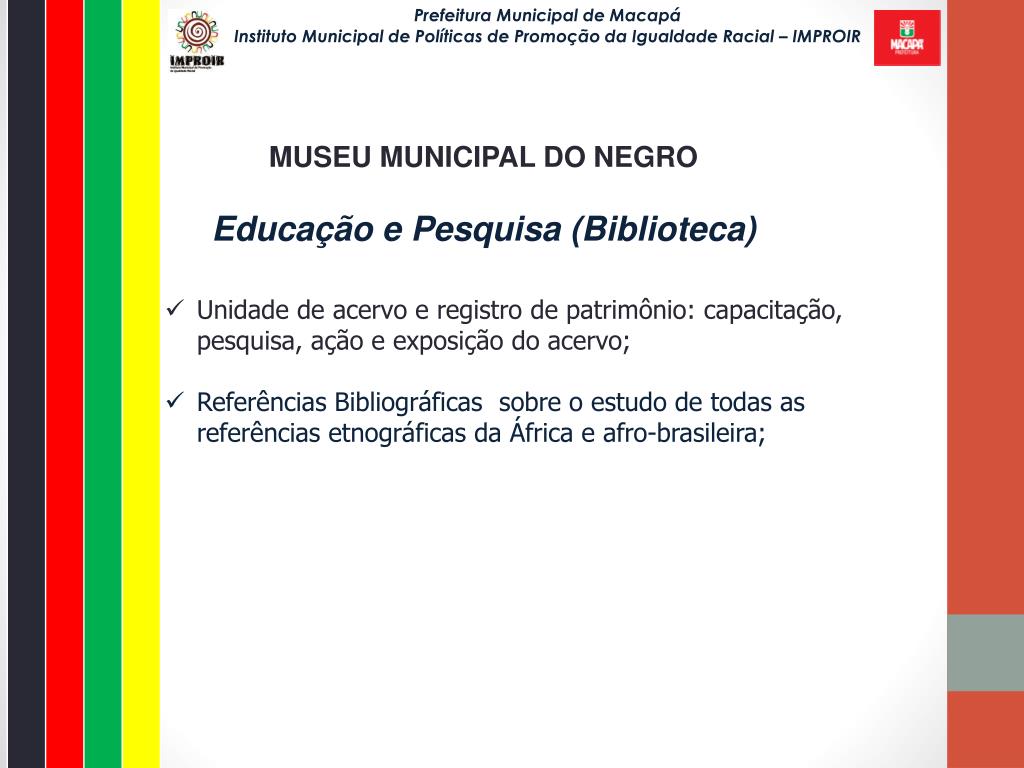 Prefeitura Municipal de Macapá Instituto Municipal de Políticas de Promoção da Igualdade Racial – IMPROIR MUSEU MUNICIPAL DO NEGRO Educação e Pesquisa (Biblioteca) • Unidade de acervo e registro de patrimônio: capacitação, pesquisa, ação e exposição do acervo; • Referências Bibliográficas sobre o estudo de todas as referências etnográficas da África e afro-brasileira;
