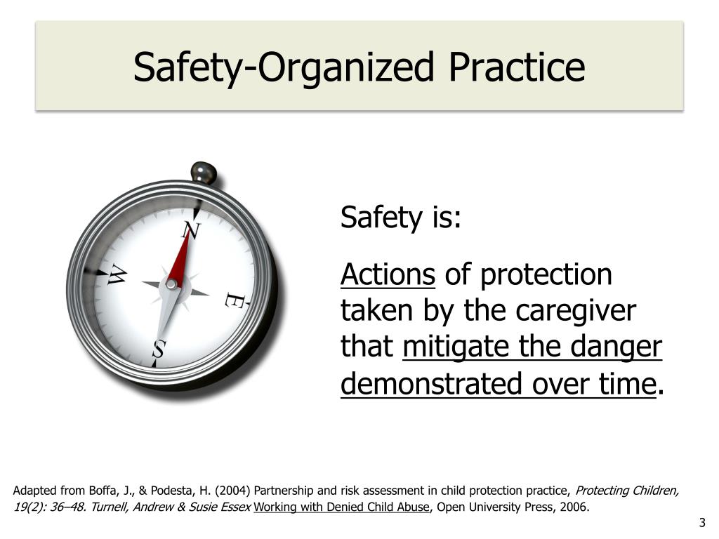 Safety-Organized Practice Safety is: Actions of protection taken by the caregiver that mitigate the danger demonstrated over time. Adapted from Boffa, J., & Podesta, H. (2004) Partnership and risk assessment in child protection practice, Protecting Children, 19(2): 36–48. Turnell, Andrew & Susie Essex Working with Denied Child Abuse, Open University Press, 2006.