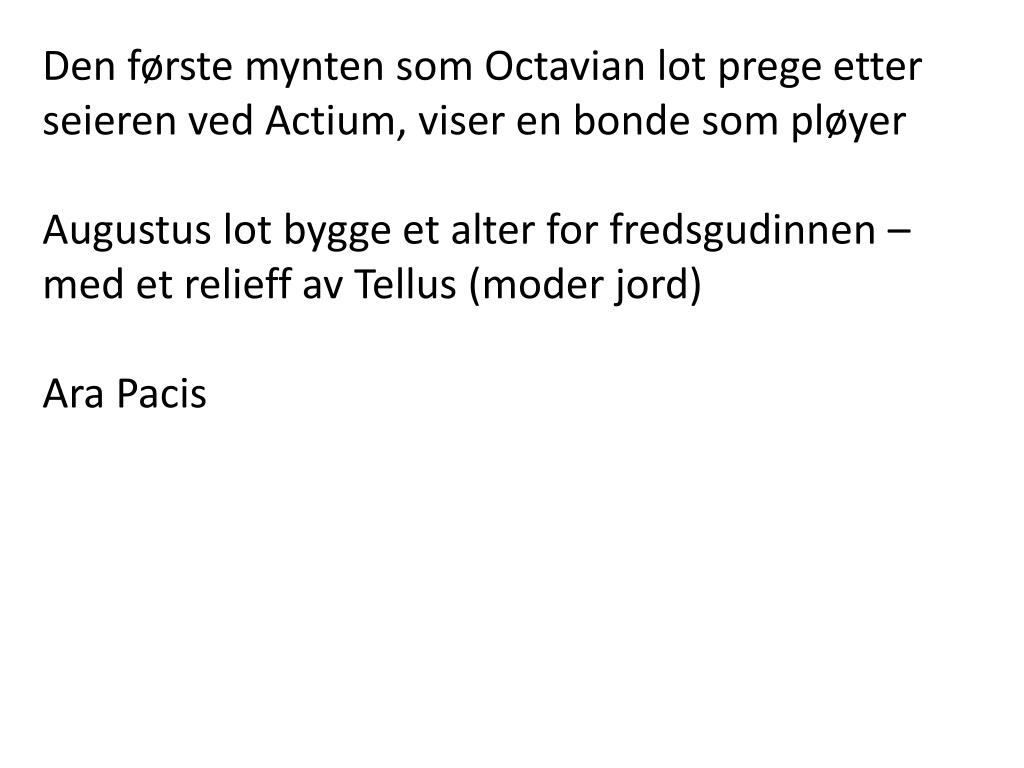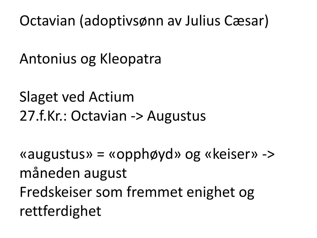 Octavian (adoptivsønn av Julius Cæsar) Antonius og Kleopatra Slaget ved Actium 27.f.Kr.: Octavian -> Augustus «augustus» = «opphøyd» og «keiser» -> måneden august Fredskeiser som fremmet enighet og rettferdighet
