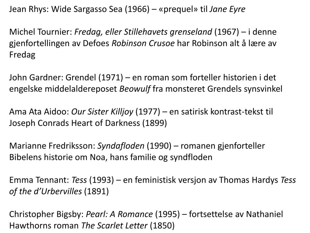 Jean Rhys: Wide Sargasso Sea (1966) – «prequel» til Jane Eyre Michel Tournier: Fredag, eller Stillehavets grenseland (1967) – i denne gjenfortellingen av Defoes Robinson Crusoe har Robinson alt å lære av Fredag John Gardner: Grendel (1971) – en roman som forteller historien i det engelske middelaldereposetBeowulf fra monsteret Grendels synsvinkel AmaAta Aidoo: Our SisterKilljoy (1977) – en satirisk kontrast-tekst til Joseph Conrads HeartofDarkness (1899) Marianne Fredriksson: Syndafloden (1990) – romanen gjenforteller Bibelens historie om Noa, hans familie og syndfloden Emma Tennant: Tess (1993) – en feministisk versjon av Thomas Hardys Tess ofthed’Urbervilles (1891) Christopher Bigsby: Pearl: A Romance (1995) – fortsettelse av Nathaniel Hawthorns roman The Scarlet Letter (1850)