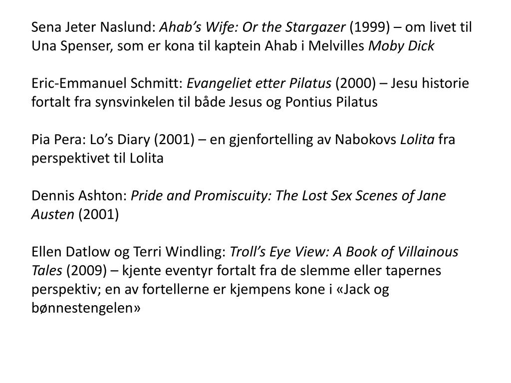 Sena Jeter Naslund: Ahab’sWife: Or theStargazer (1999) – om livet til Una Spenser, som er kona til kaptein Ahab i Melvilles Moby Dick Eric-Emmanuel Schmitt: Evangeliet etter Pilatus (2000) – Jesu historie fortalt fra synsvinkelen til både Jesus og Pontius Pilatus Pia Pera: Lo’s Diary (2001) – en gjenfortelling av NabokovsLolita fra perspektivet til Lolita Dennis Ashton: Pride and Promiscuity: The Lost Sex Scenes of Jane Austen(2001) Ellen Datlow og TerriWindling: Troll’sEyeView: A Book ofVillainous Tales (2009) – kjente eventyr fortalt fra de slemme eller tapernes perspektiv; en av fortellerne er kjempens kone i «Jack og bønnestengelen»