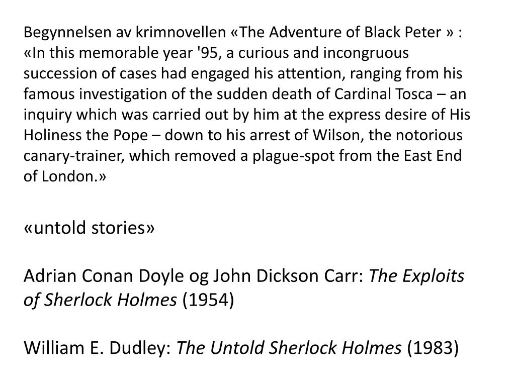 Begynnelsenavkrimnovellen«The Adventure of Black Peter» : «In this memorable year '95, a curious and incongruous succession of cases had engaged his attention, ranging from his famous investigation of the sudden death of Cardinal Tosca – an inquiry which was carried out by him at the express desire of His Holiness the Pope – down to his arrest of Wilson, the notorious canary-trainer, which removed a plague-spot from the East End of London.» «untoldstories» Adrian Conan Doyle og John Dickson Carr: The Exploits of Sherlock Holmes (1954) William E. Dudley: The Untold Sherlock Holmes (1983)