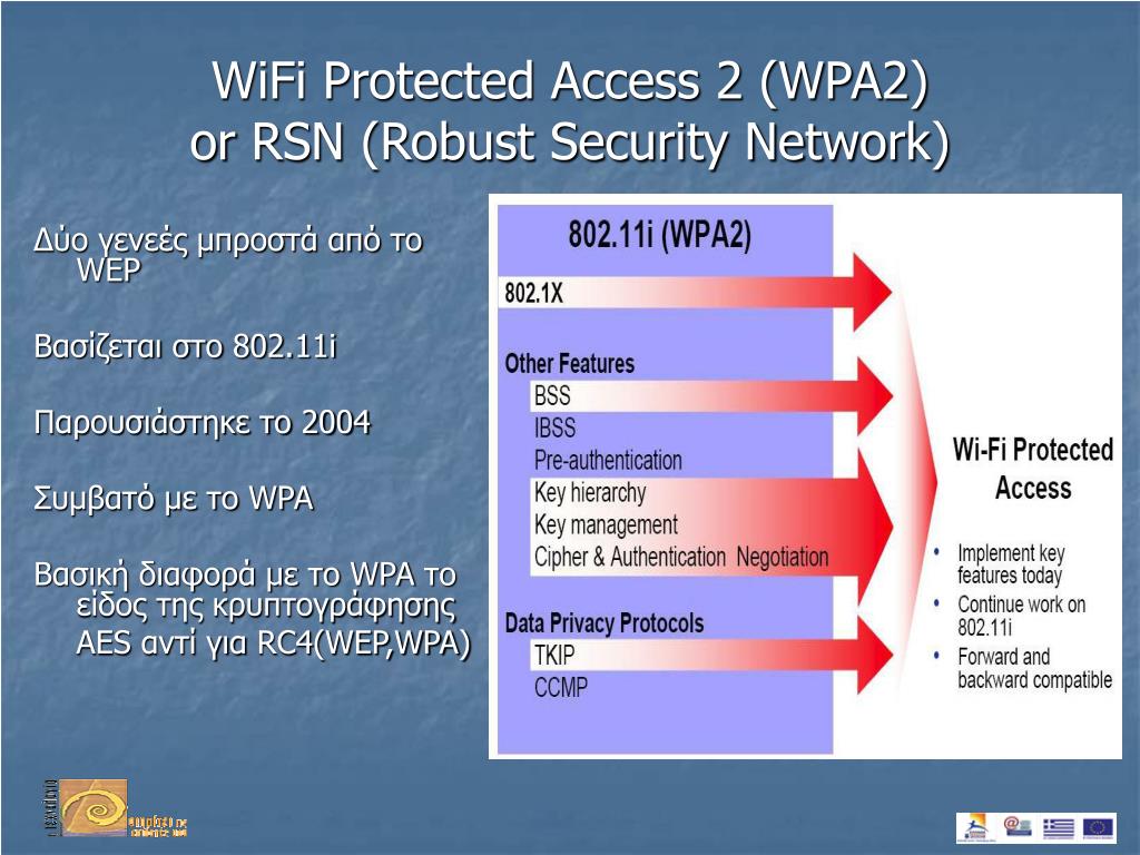 WiFi Protected Access 2 (WPA2)or RSN (Robust Security Network) Δύο γενεές μπροστά από το WEP Βασίζεται στο 802.11i Παρουσιάστηκε το 2004 Συμβατό με το WPA Βασική διαφορά με το WPA το είδος της κρυπτογράφησης AES αντί για RC4(WEP,WPA)