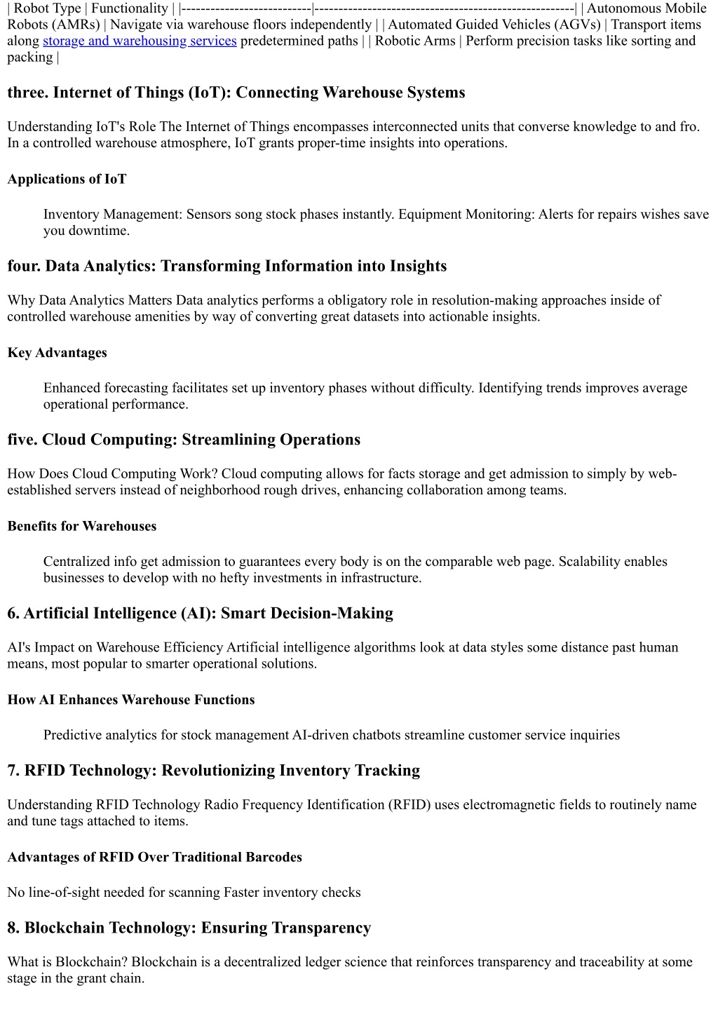 | Robot Type | Functionality | |---------------------------|------------------------------------------------------| | Autonomous Mobile Robots (AMRs) | Navigate via warehouse floors independently | | Automated Guided Vehicles (AGVs) | Transport items along storage and warehousing services predetermined paths | | Robotic Arms | Perform precision tasks like sorting and packing | three. Internet of Things (IoT): Connecting Warehouse Systems Understanding IoT's Role The Internet of Things encompasses interconnected units that converse knowledge to and fro. In a controlled warehouse atmosphere, IoT grants proper-time insights into operations. Applications of IoT Inventory Management: Sensors song stock phases instantly. Equipment Monitoring: Alerts for repairs wishes save you downtime. four. Data Analytics: Transforming Information into Insights Why Data Analytics Matters Data analytics performs a obligatory role in resolution-making approaches inside of controlled warehouse amenities by way of converting great datasets into actionable insights. Key Advantages Enhanced forecasting facilitates set up inventory phases without difficulty. Identifying trends improves average operational performance. five. Cloud Computing: Streamlining Operations How Does Cloud Computing Work? Cloud computing allows for facts storage and get admission to simply by web- established servers instead of neighborhood rough drives, enhancing collaboration among teams. Benefits for Warehouses Centralized info get admission to guarantees every body is on the comparable web page. Scalability enables businesses to develop with no hefty investments in infrastructure. 6. Artificial Intelligence (AI): Smart Decision-Making AI's Impact on Warehouse Efficiency Artificial intelligence algorithms look at data styles some distance past human means, most popular to smarter operational solutions. How AI Enhances Warehouse Functions Predictive analytics for stock management AI-driven chatbots streamline customer service inquiries 7. RFID Technology: Revolutionizing Inventory Tracking Understanding RFID Technology Radio Frequency Identification (RFID) uses electromagnetic fields to routinely name and tune tags attached to items. Advantages of RFID Over Traditional Barcodes No line-of-sight needed for scanning Faster inventory checks 8. Blockchain Technology: Ensuring Transparency What is Blockchain? Blockchain is a decentralized ledger science that reinforces transparency and traceability at some stage in the grant chain.