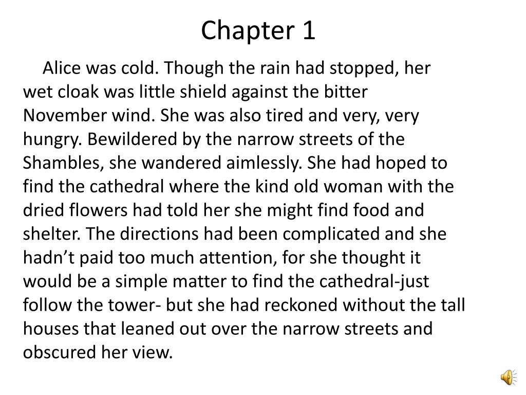 Chapter 1 Alice was cold. Though the rain had stopped, her wet cloak was little shield against the bitter November wind. She was also tired and very, very hungry. Bewildered by the narrow streets of the Shambles, she wandered aimlessly. She had hoped to find the cathedral where the kind old woman with the dried flowers had told her she might find food and shelter. The directions had been complicated and she hadn’t paid too much attention, for she thought it would be a simple matter to find the cathedral-just follow the tower- but she had reckoned without the tall houses that leaned out over the narrow streets and obscured her view.