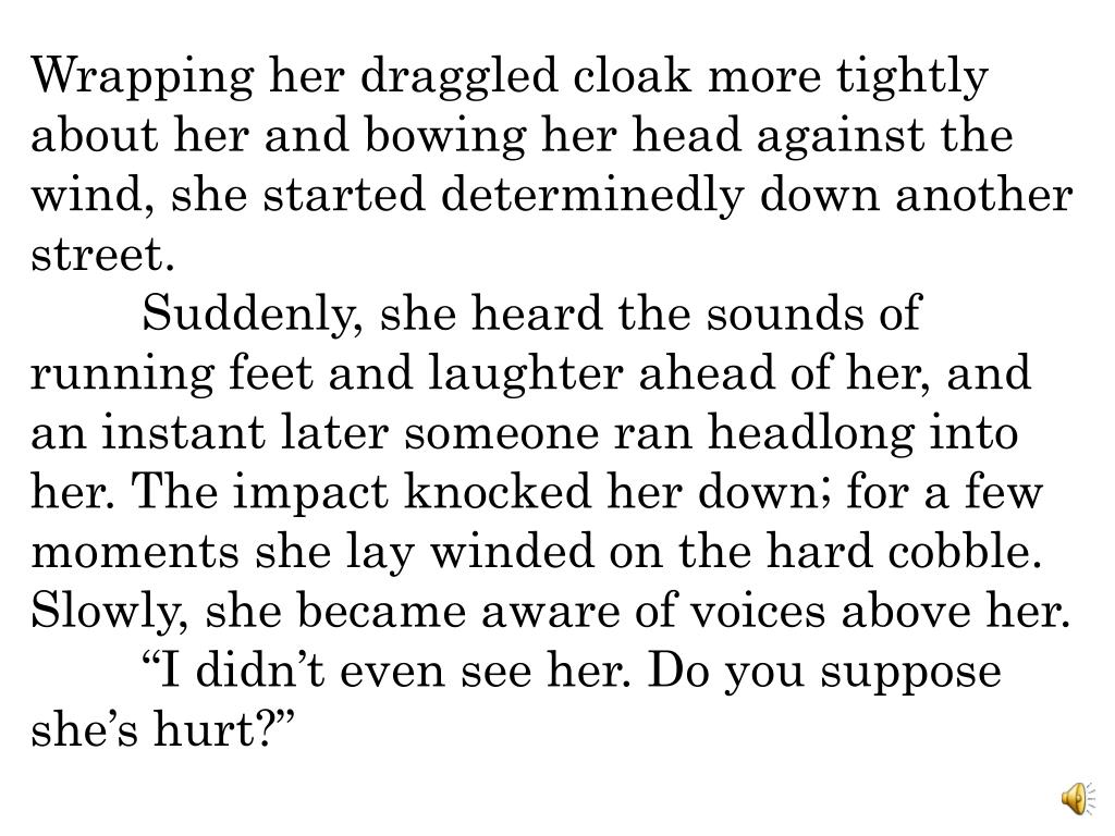 Wrapping her draggled cloak more tightly about her and bowing her head against the wind, she started determinedly down another street. Suddenly, she heard the sounds of running feet and laughter ahead of her, and an instant later someone ran headlong into her. The impact knocked her down; for a few moments she lay winded on the hard cobble. Slowly, she became aware of voices above her. “I didn’t even see her. Do you suppose she’s hurt?”