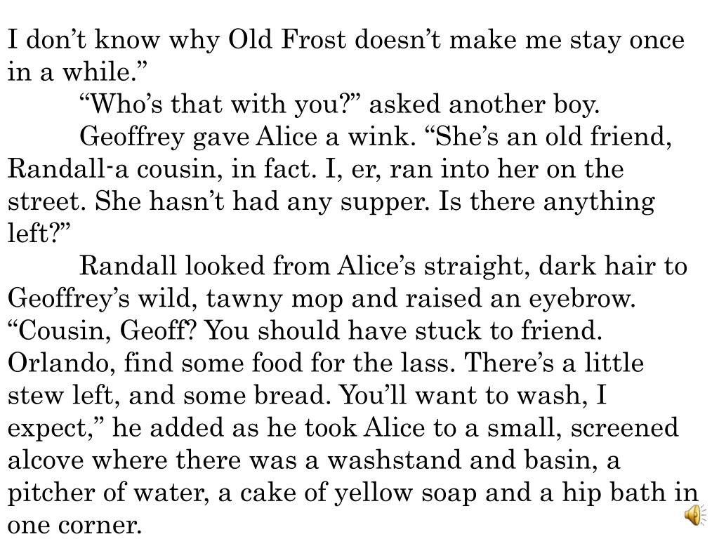 I don’t know why Old Frost doesn’t make me stay once in a while.” “Who’s that with you?” asked another boy. Geoffrey gave Alice a wink. “She’s an old friend, Randall-a cousin, in fact. I, er, ran into her on the street. She hasn’t had any supper. Is there anything left?” Randall looked from Alice’s straight, dark hair to Geoffrey’s wild, tawny mop and raised an eyebrow. “Cousin, Geoff? You should have stuck to friend. Orlando, find some food for the lass. There’s a little stew left, and some bread. You’ll want to wash, I expect,” he added as he took Alice to a small, screened alcove where there was a washstand and basin, a pitcher of water, a cake of yellow soap and a hip bath in one corner.
