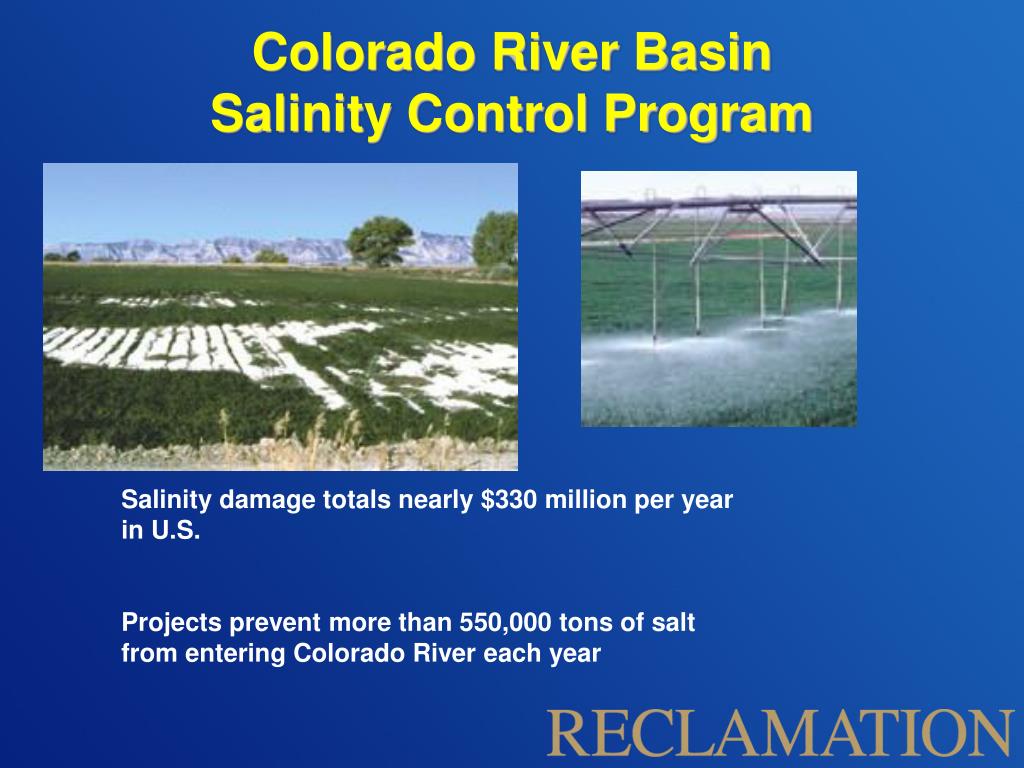 Colorado River Basin Salinity Control Program Salinity damage totals nearly $330 million per year in U.S. Projects prevent more than 550,000 tons of salt from entering Colorado River each year