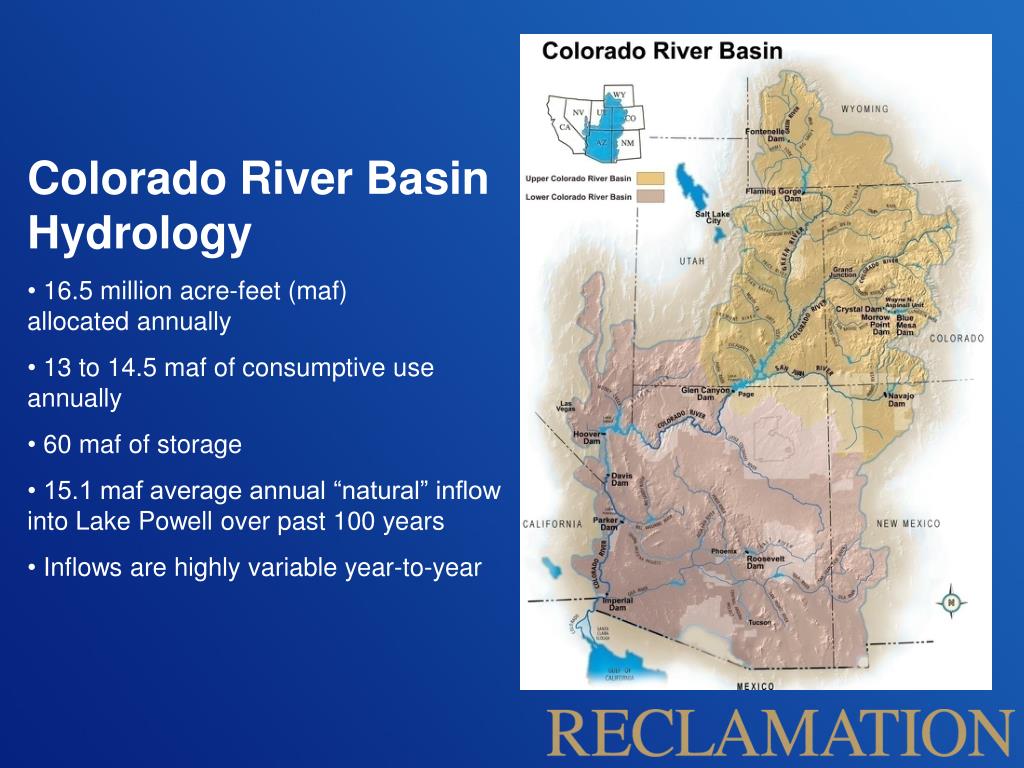 A Perspective on Today’s Colorado River Issues. Upper Colorado Region River Basins. Green, Colorado and San Juan Rivers. Colorado River Basin Hydrology 16.5 million acre-feet (maf) allocated annually 13 to 14.5 maf of consumptive use annually 60 maf of storage