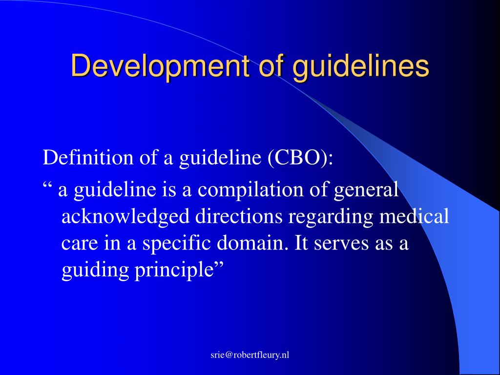 Development of guidelines Definition of a guideline (CBO): “ a guideline is a compilation of general acknowledged directions regarding medical care in a specific domain. It serves as a guiding principle” srie@robertfleury.nl
