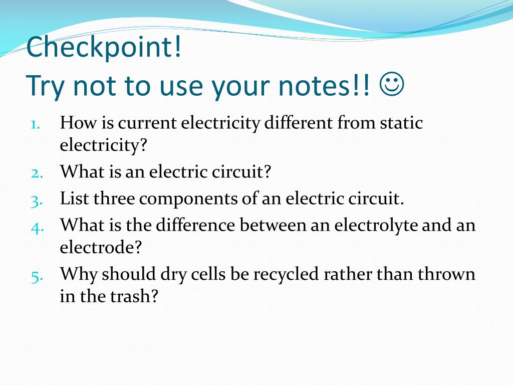 Checkpoint! Try not to use your notes!! • How is current electricity different from static electricity? • What is an electric circuit? • List three components of an electric circuit. • What is the difference between an electrolyte and an electrode? • Why should dry cells be recycled rather than thrown in the trash?
