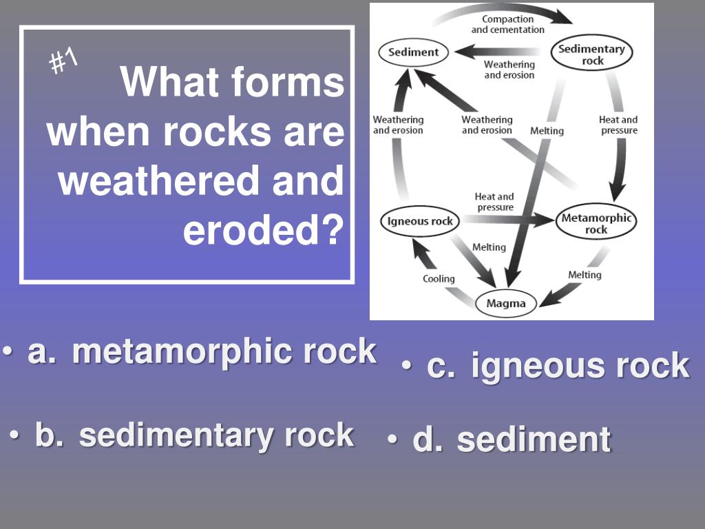 ROCKS. What forms when rocks are weathered and eroded?. #1. a. metamorphic rock. c. igneous rock. b. sedimentary rock. d. sediment. Which of the following processes is NOT part of the rock cycle?. # 2. a. solidification. c. erosion. d. metamorphism. b. chiseling.
