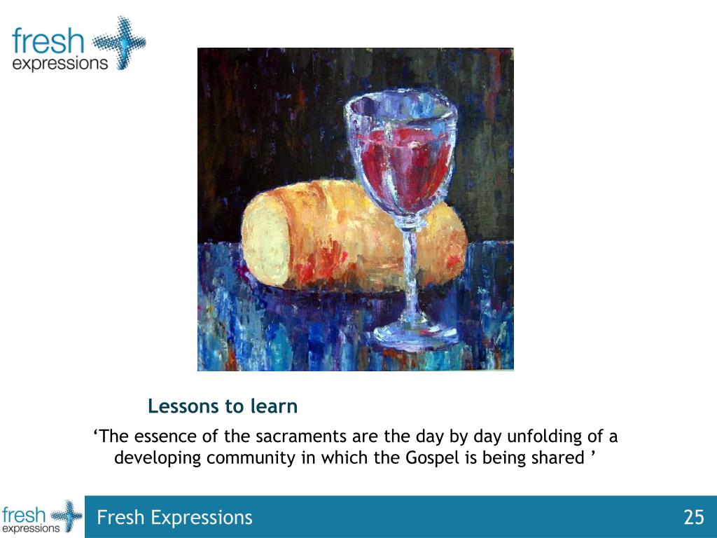 Lessons to learn ‘The essence of the sacraments are the day by day unfolding of a developing community in which the Gospel is being shared ’ Fresh Expressions