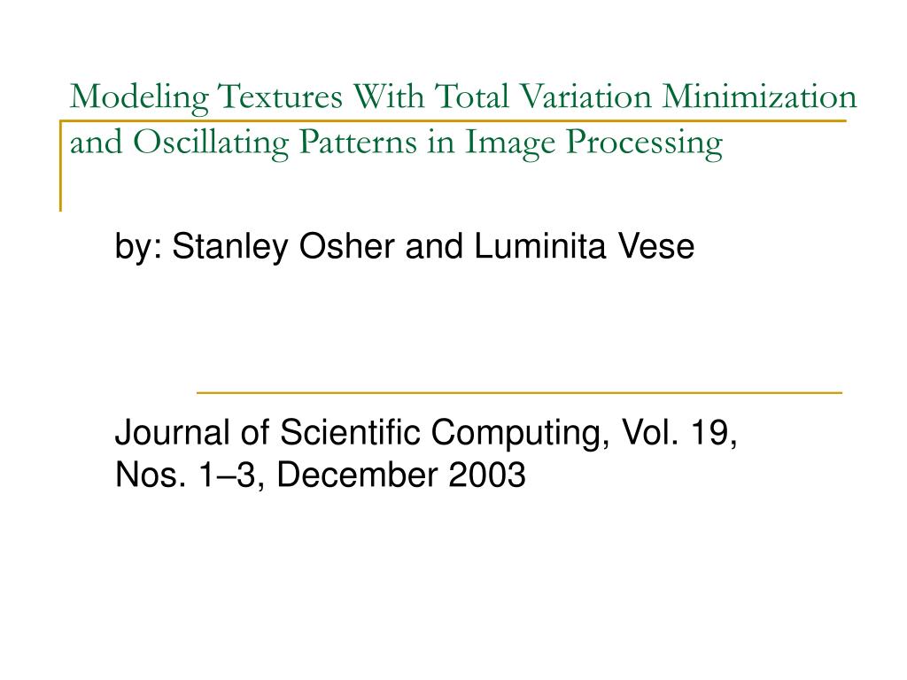 Modeling Textures With Total Variation Minimization and Oscillating Patterns in Image Processing by: Stanley Osher and Luminita Vese Journal of Scientific Computing, Vol. 19, Nos. 1–3, December 2003