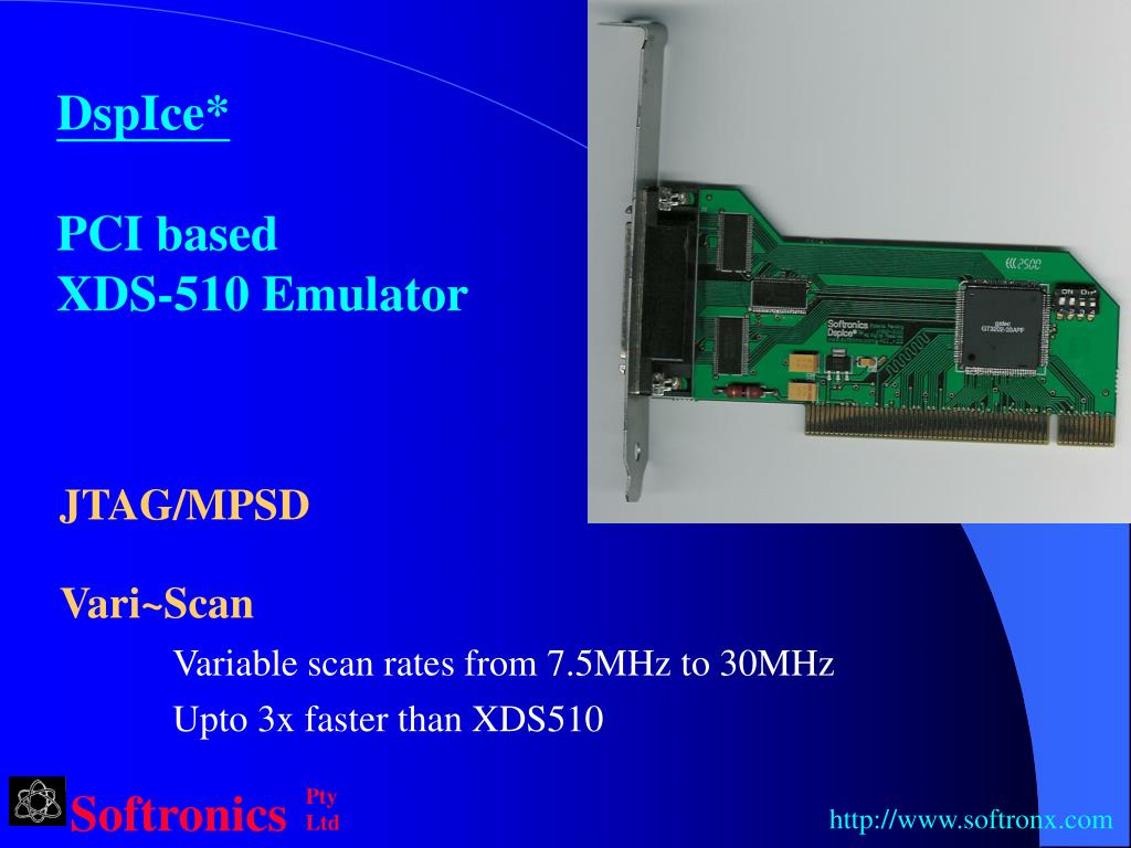JTAG/MPSD Vari~Scan Variable scan rates from 7.5MHz to 30MHz Upto 3x faster than XDS510 DspIce* PCI based XDS-510 Emulator Softronics Pty Ltd http://www.softronx.com