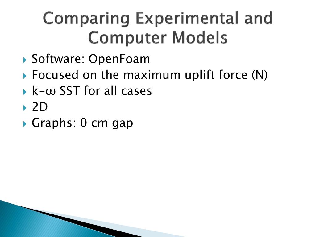 Comparing Experimental and Computer Models • Software: OpenFoam • Focused on the maximum uplift force (N) • k-ωSST for all cases • 2D • Graphs: 0 cm gap