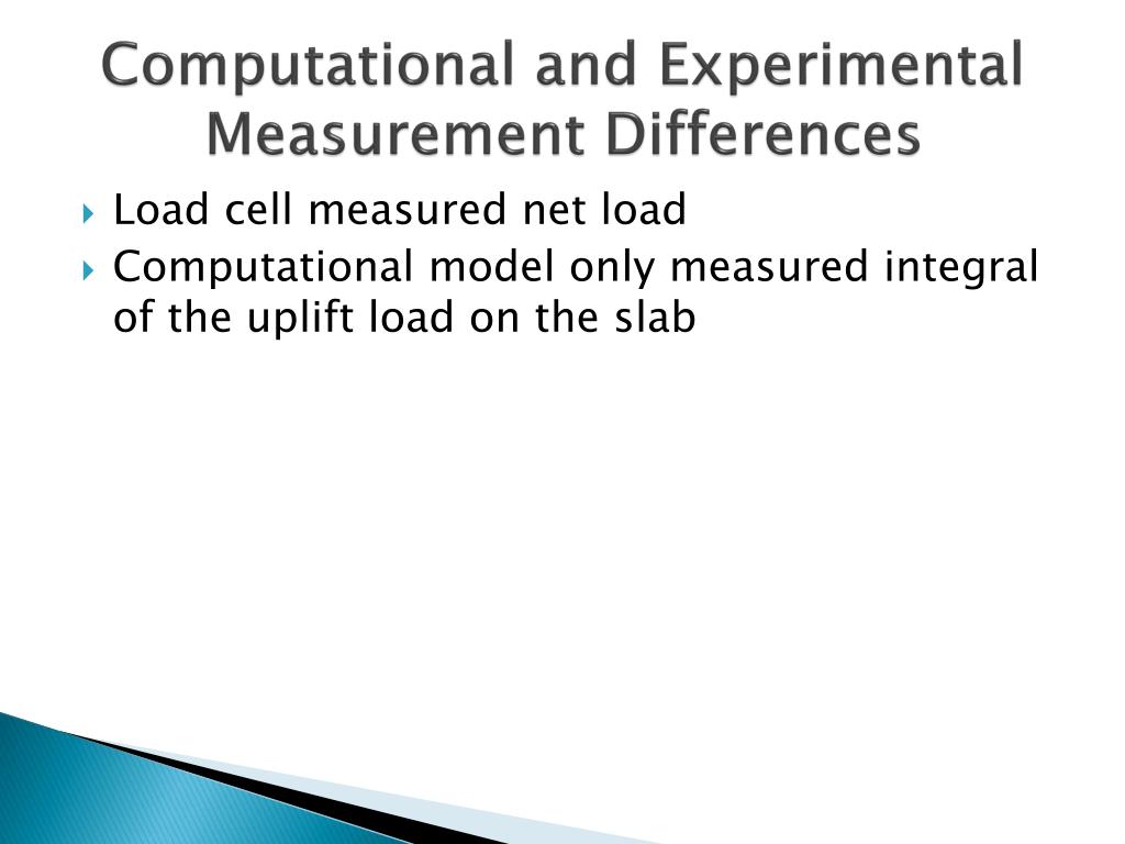 Computational and Experimental Measurement Differences • Load cell measured net load • Computational model only measured integral of the uplift load on the slab