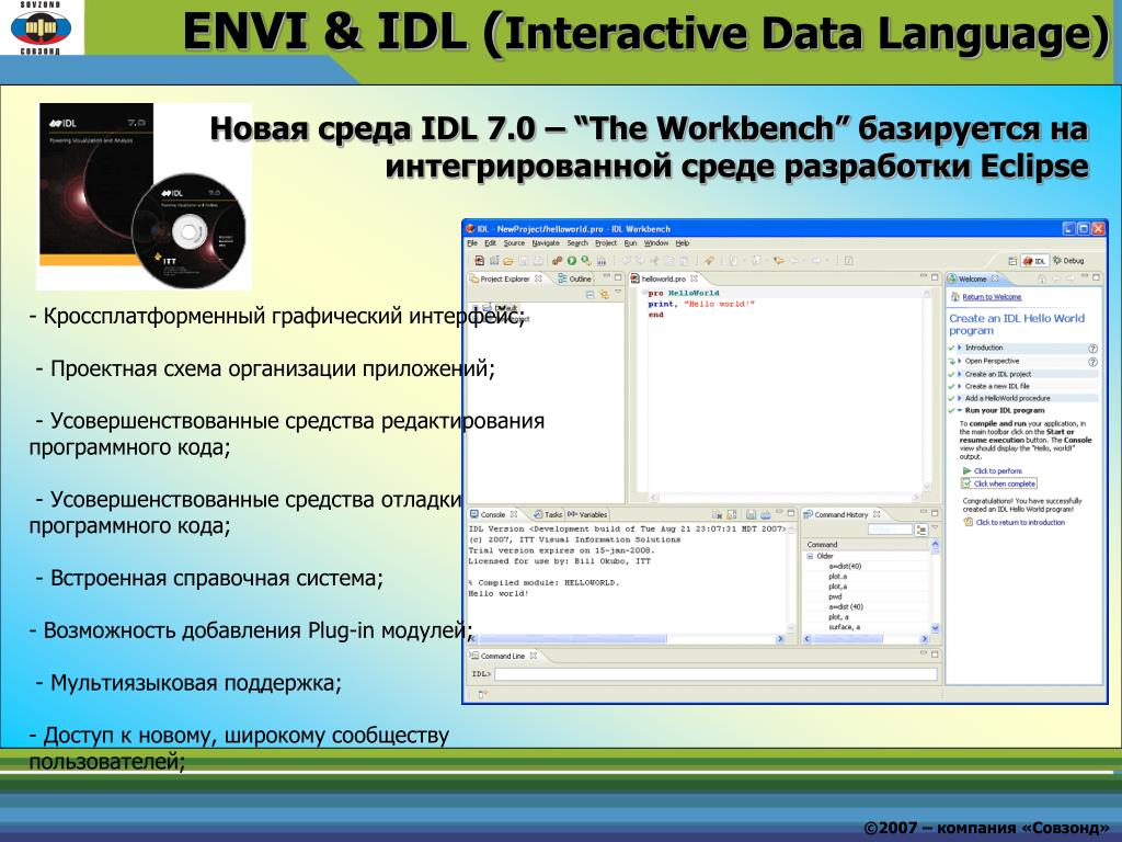 ENVI & IDL (Interactive Data Language) Новая среда IDL 7.0 – “The Workbench” базируется на интегрированной среде разработки Eclipse • Кроссплатформенный графический интерфейс; - Проектная схема организации приложений; - Усовершенствованные средства редактирования программного кода; - Усовершенствованные средства отладки программного кода; - Встроенная справочная система;- Возможность добавления Plug-in модулей; - Мультиязыковая поддержка;- Доступ к новому, широкому сообществу пользователей;