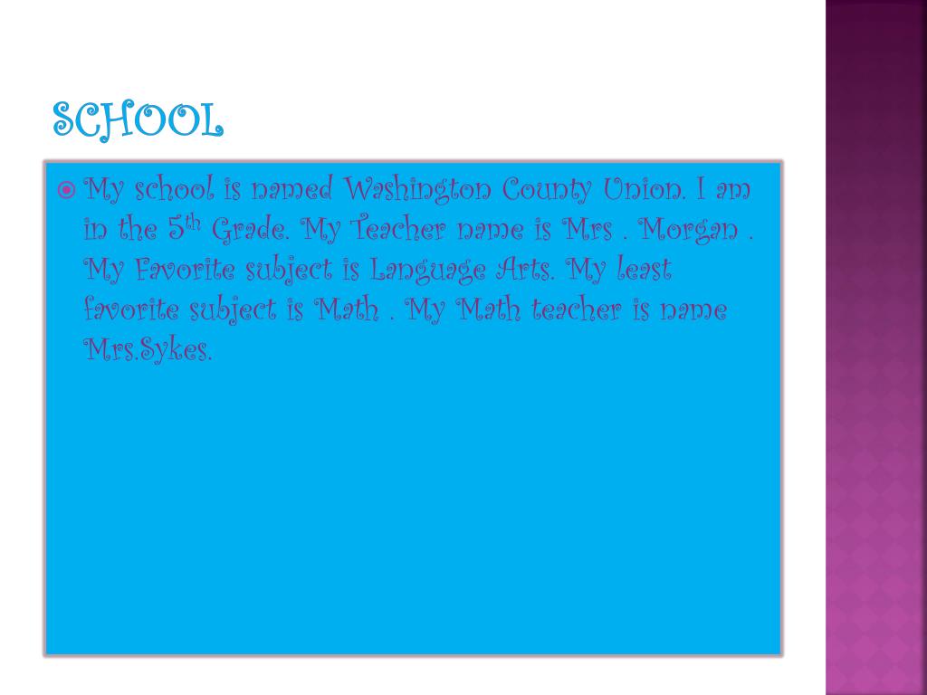 School • My school is named Washington County Union. I am in the 5th Grade. My Teacher name is Mrs . Morgan . My Favorite subject is Language Arts. My least favorite subject is Math . My Math teacher is name Mrs.Sykes.
