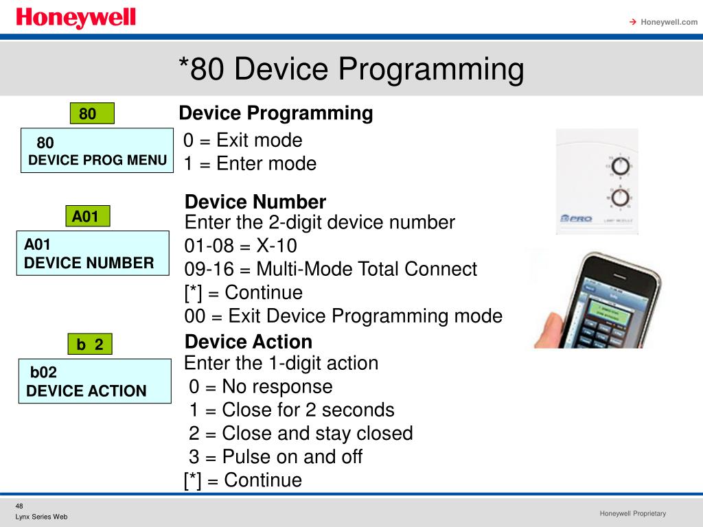 *80 Device Programming Device Programming 80 0 = Exit mode 1 = Enter mode 80 DEVICE PROG MENU Device Number A01 Enter the 2-digit device number 01-08 = X-10 09-16 = Multi-Mode Total Connect [*] = Continue 00 = Exit Device Programming mode A01 DEVICE NUMBER Device Action b 2 Enter the 1-digit action 0 = No response 1 = Close for 2 seconds 2 = Close and stay closed 3 = Pulse on and off [*] = Continue b02 DEVICE ACTION