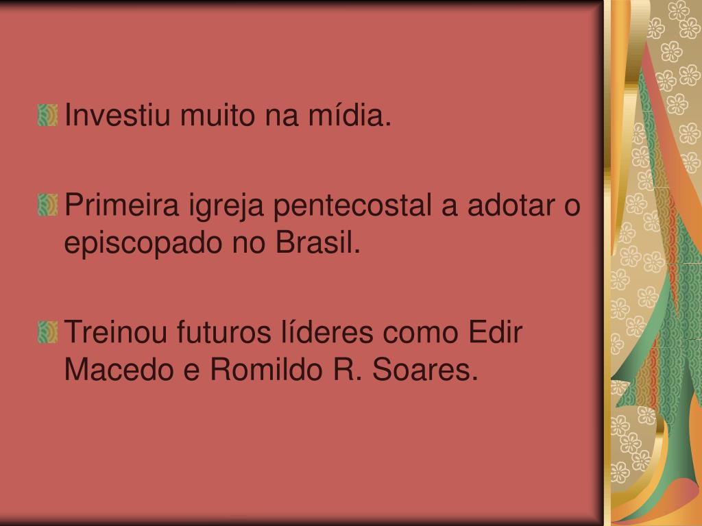 Investiu muito na mídia. • Primeira igreja pentecostal a adotar o episcopado no Brasil. • Treinou futuros líderes como Edir Macedo e Romildo R. Soares.
