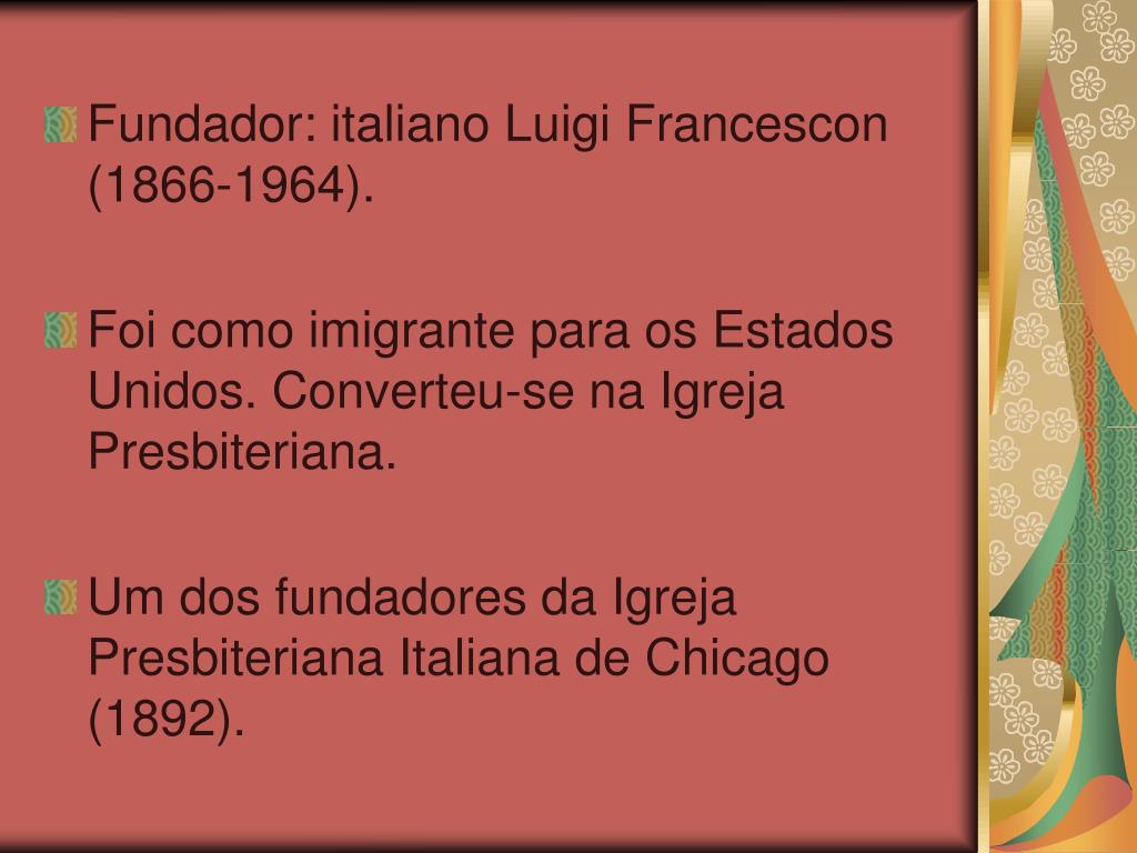 Fundador: italiano Luigi Francescon (1866-1964). • Foi como imigrante para os Estados Unidos. Converteu-se na Igreja Presbiteriana. • Um dos fundadores da Igreja Presbiteriana Italiana de Chicago (1892).
