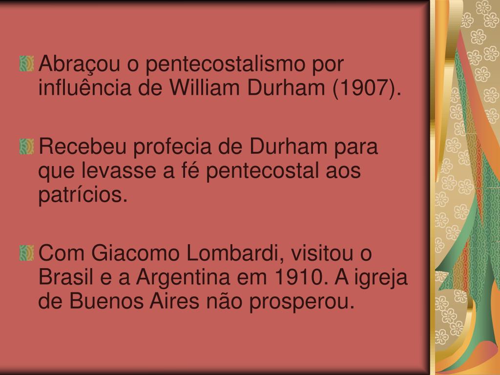 Abraçou o pentecostalismo por influência de William Durham (1907). • Recebeu profecia de Durham para que levasse a fé pentecostal aos patrícios. • Com Giacomo Lombardi, visitou o Brasil e a Argentina em 1910. A igreja de Buenos Aires não prosperou.
