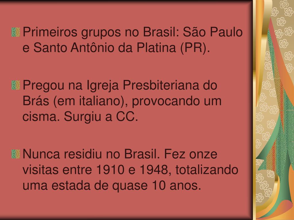 Primeiros grupos no Brasil: São Paulo e Santo Antônio da Platina (PR). • Pregou na Igreja Presbiteriana do Brás (em italiano), provocando um cisma. Surgiu a CC. • Nunca residiu no Brasil. Fez onze visitas entre 1910 e 1948, totalizando uma estada de quase 10 anos.