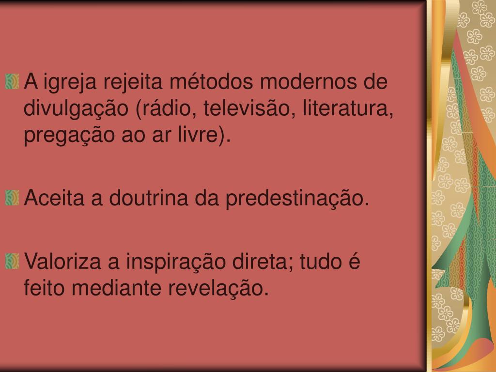 A igreja rejeita métodos modernos de divulgação (rádio, televisão, literatura, pregação ao ar livre). • Aceita a doutrina da predestinação. • Valoriza a inspiração direta; tudo é feito mediante revelação.