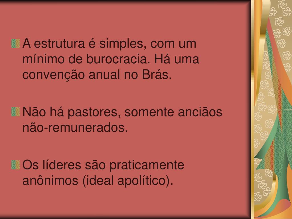 A estrutura é simples, com um mínimo de burocracia. Há uma convenção anual no Brás. • Não há pastores, somente anciãos não-remunerados. • Os líderes são praticamente anônimos (ideal apolítico).