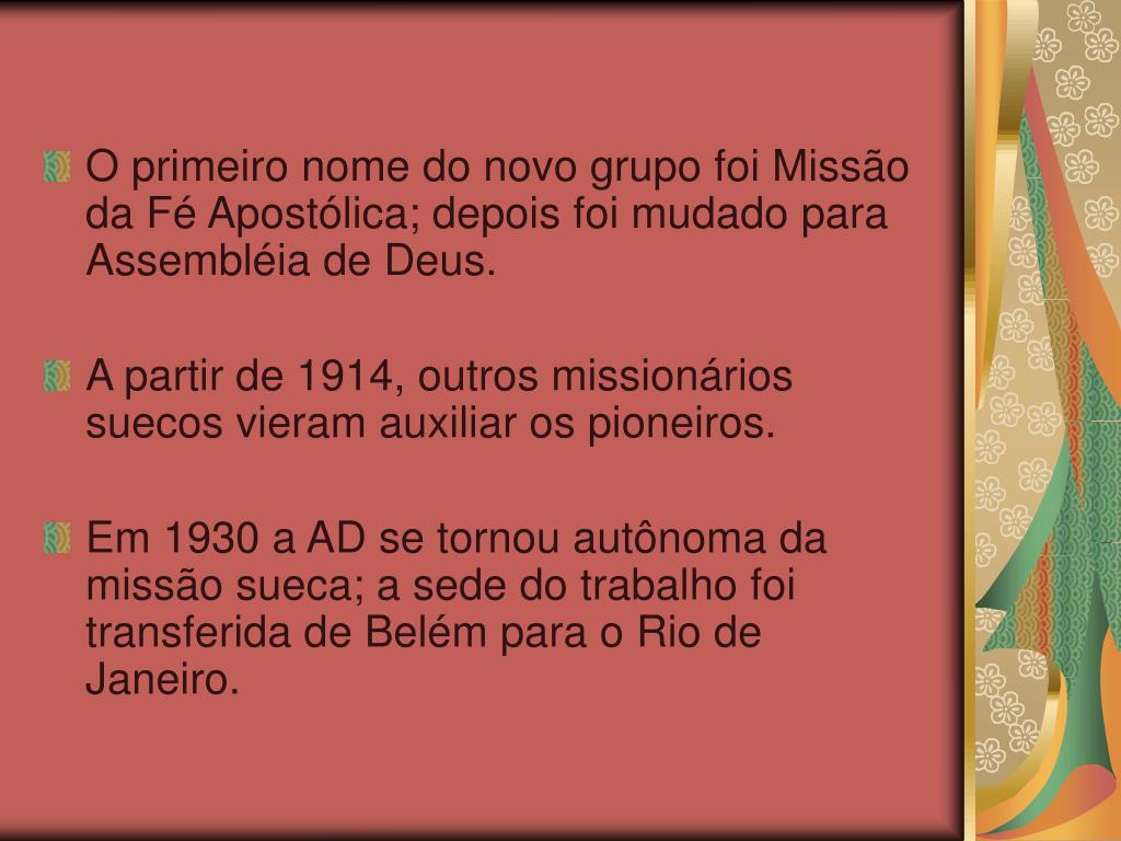 O primeiro nome do novo grupo foi Missão da Fé Apostólica; depois foi mudado para Assembléia de Deus. • A partir de 1914, outros missionários suecos vieram auxiliar os pioneiros. • Em 1930 a AD se tornou autônoma da missão sueca; a sede do trabalho foi transferida de Belém para o Rio de Janeiro.