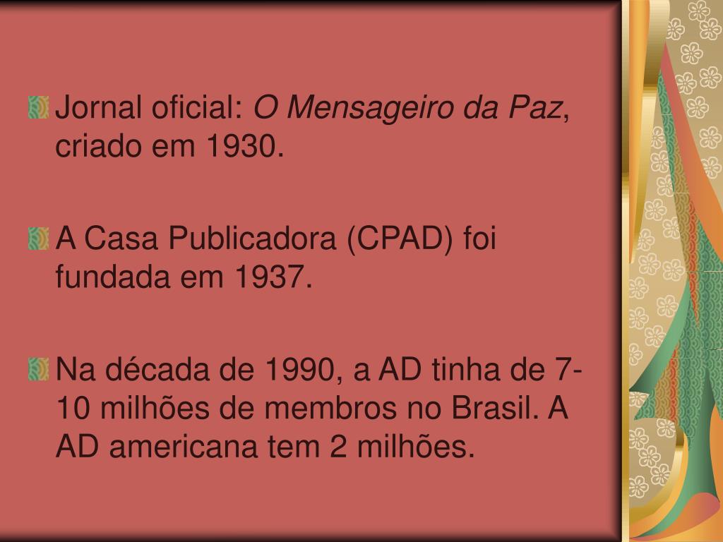 Jornal oficial: O Mensageiro da Paz, criado em 1930. • A Casa Publicadora (CPAD) foi fundada em 1937. • Na década de 1990, a AD tinha de 7-10 milhões de membros no Brasil. A AD americana tem 2 milhões.
