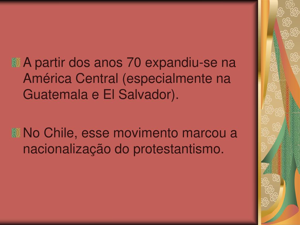 A partir dos anos 70 expandiu-se na América Central (especialmente na Guatemala e El Salvador). • No Chile, esse movimento marcou a nacionalização do protestantismo.