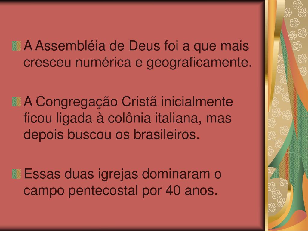 A Assembléia de Deus foi a que mais cresceu numérica e geograficamente. • A Congregação Cristã inicialmente ficou ligada à colônia italiana, mas depois buscou os brasileiros. • Essas duas igrejas dominaram o campo pentecostal por 40 anos.