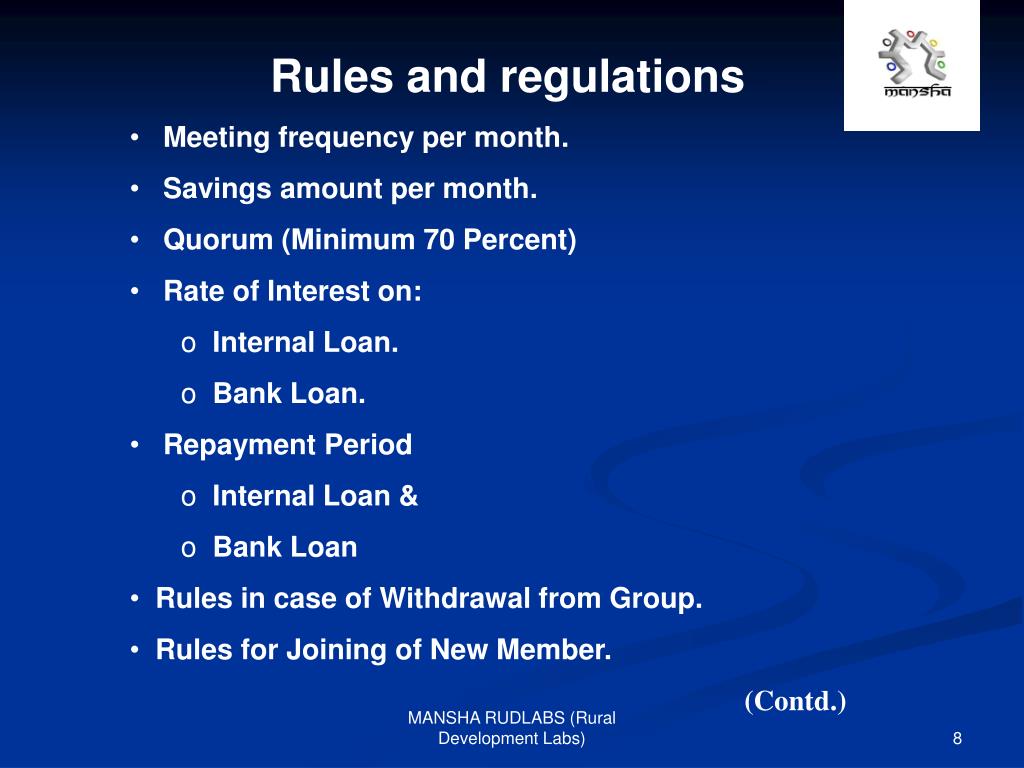 Rules and regulations • Meeting frequency per month. • Savings amount per month. • Quorum (Minimum 70 Percent) • Rate of Interest on: • Internal Loan. • Bank Loan. • Repayment Period • Internal Loan & • Bank Loan • Rules in case of Withdrawal from Group. • Rules for Joining of New Member. • (Contd.) MANSHA RUDLABS (Rural Development Labs)