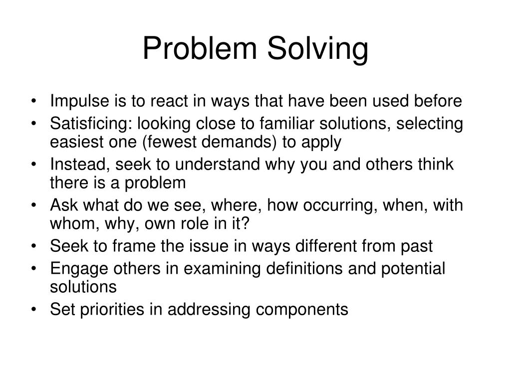 Problem Solving • Impulse is to react in ways that have been used before • Satisficing: looking close to familiar solutions, selecting easiest one (fewest demands) to apply • Instead, seek to understand why you and others think there is a problem • Ask what do we see, where, how occurring, when, with whom, why, own role in it? • Seek to frame the issue in ways different from past • Engage others in examining definitions and potential solutions • Set priorities in addressing components