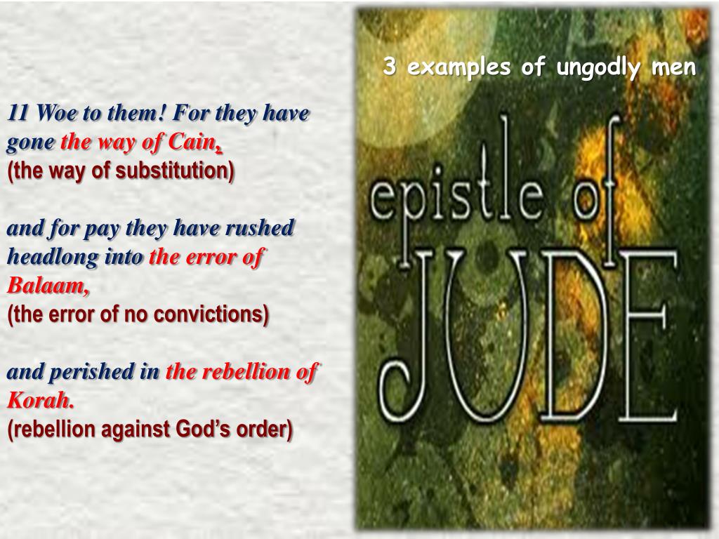 11 Woe to them! For they have gone the way of Cain, (the way of substitution) and for pay they have rushed headlong into the error of Balaam, (the error of no convictions) and perished in the rebellion of Korah. (rebellion against God’s order) 3 examples of ungodly men
