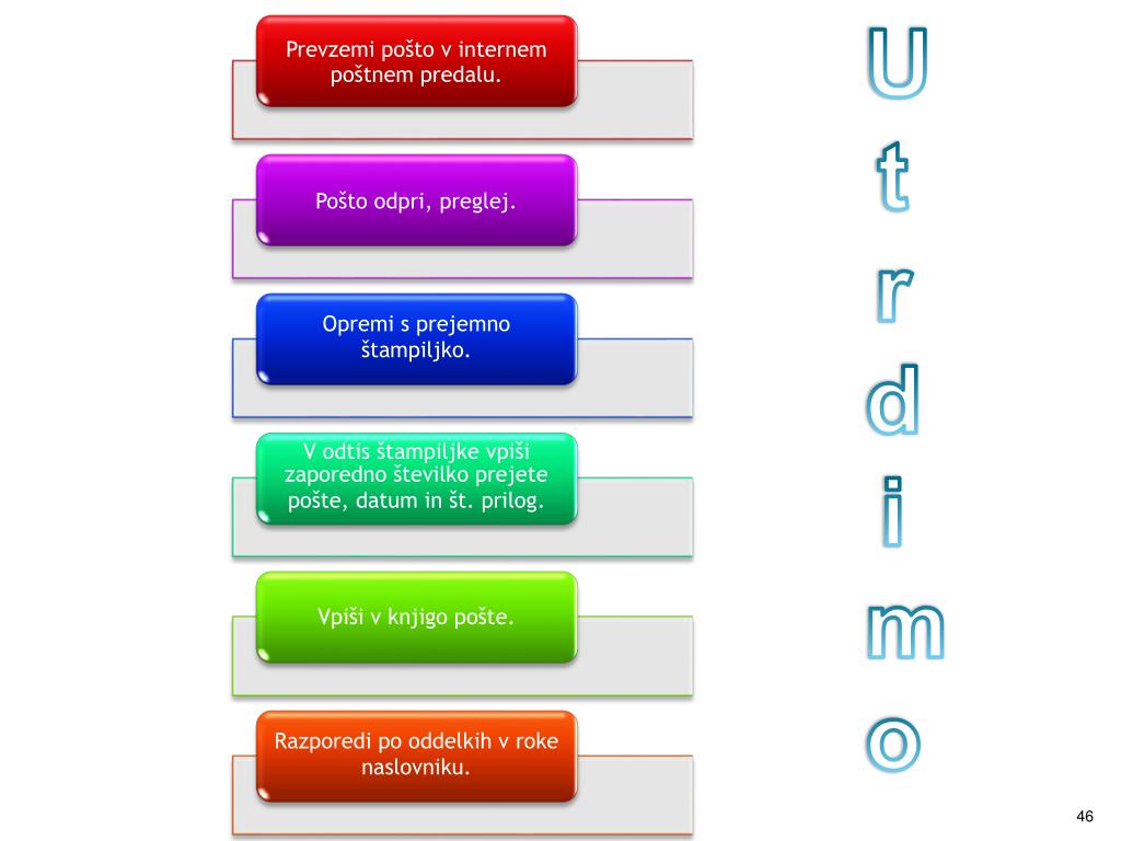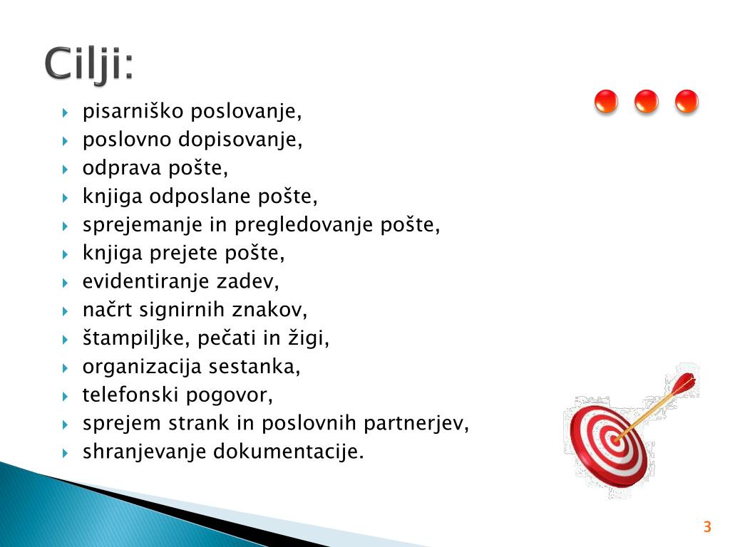 Cilji: • pisarniško poslovanje, • poslovno dopisovanje, • odprava pošte, • knjiga odposlane pošte, • sprejemanje in pregledovanje pošte, • knjiga prejete pošte, • evidentiranje zadev, • načrt signirnih znakov, • štampiljke, pečati in žigi, • organizacija sestanka, • telefonski pogovor, • sprejem strank in poslovnih partnerjev, • shranjevanje dokumentacije.